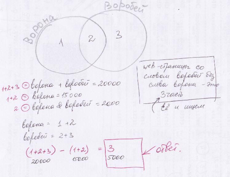 Сколько будет найдено web-страниц, на которых встречается слово Воробей, но не встречается слово Ворона. Если известно что Ворона V Воробей=20000, Ворона=15000, Ворона / Воробей=2000?