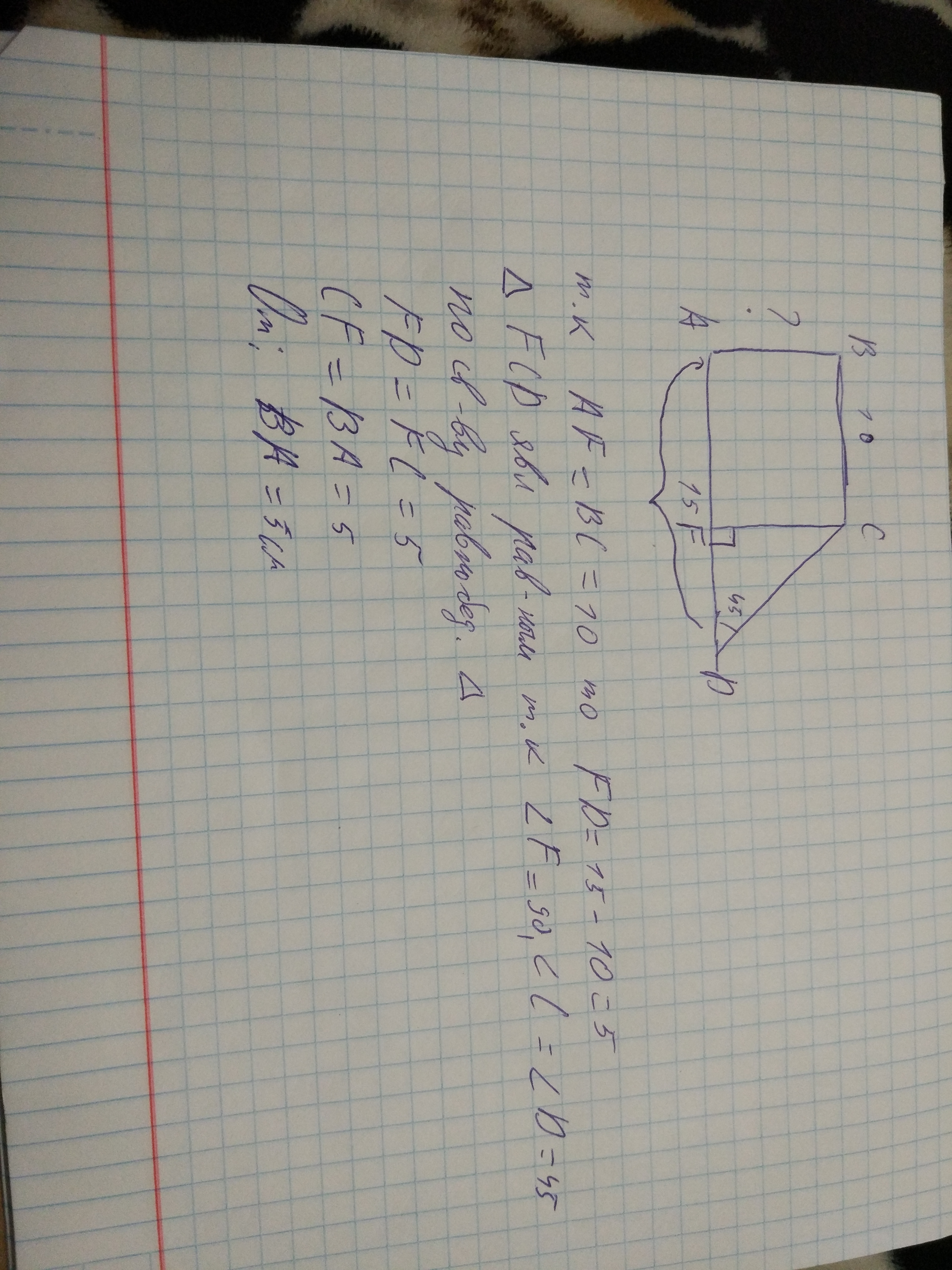 Основание прямоугольной трапеции равны a и b,один из углов равен а.Найдите:б)меньшую боковую сторону трапеции,если a=10 см,b=15 см,a=45 градусов