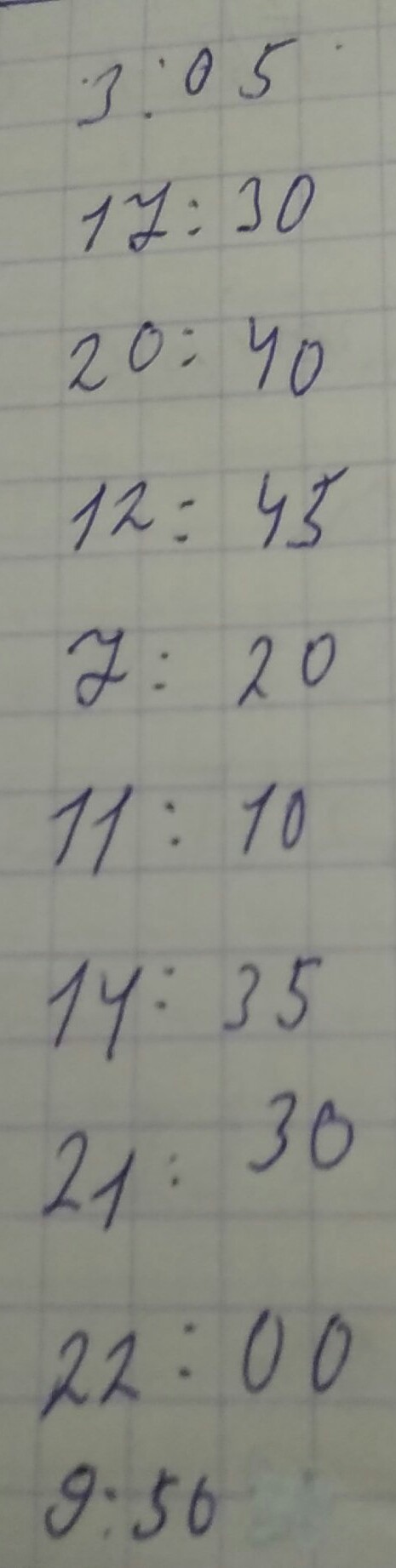 3:05 It's five past three am, 17:30 it's half past five pm, 20:40 it's twenty to nine pm, 12:45 it's a quarter to twelve pm, 7:20 it's twenty past eigtht am, 11:10 it's ten past eleven am, 14:35 it's twenty five past two pm, 21:30 it's half to ten pm, 22:00 ten o'clock, 9:50 it's ten to ten am.