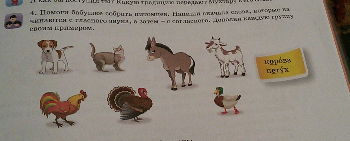 С согласного звука:Собака, кошка, коза,петух. Гусь.