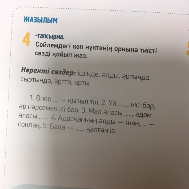 1. алды. 2. ішінде. 3. сыртында. ішінде. 4. арты. 5. артта.