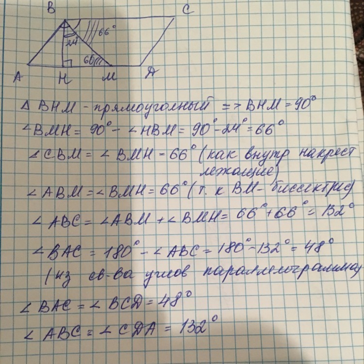Угол между высотой BH параллелограмма ABCD и биссектрисой BM угла ABC равняется 24 гр. Найдите углы параллелограмма