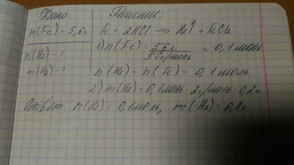 Вычислите кол-во вещества и массу газа ,которое выделяется в результате реакции 5.6 грамм железа с соляной кислотой.
