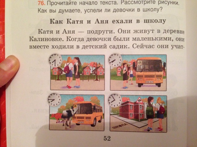 Катя и Аня одновременно вышли из дома ,и по этому они встретились возле дороги. За ними приехал автобус. Из-за коровы проходившая дорогу автобус остановился. Девочки вовремя приехали в школу.