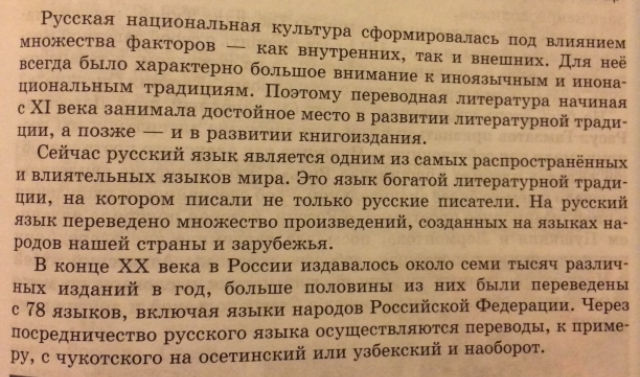 В конце ХХ века в России издавалось семь тысяч изданий в год.Через посредничество русского языка осуществляются переводы, например, с чукотского на осетинский и наоборот. (Последнее предложение можно вообще не брать).