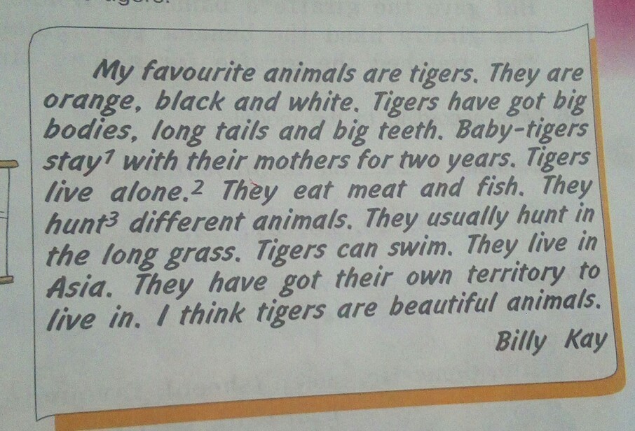 Мои любые животные тигры. Они оранжевые, черные и белые. У тигров большое тело, длинный хвост и большие зубы. Тигрята остаются со своей мамой на протяжении 2 лет. Тигры живут поодиночке. Они едят мясо и рыбу. Они охотятся на разных животных. Обычно они охотятся в длинной траве. Тигры умеют плавать. Они живут в Азии. У них есть собственная территория, на которой они живут. Я считаю, что тигры - замечательные животные.
