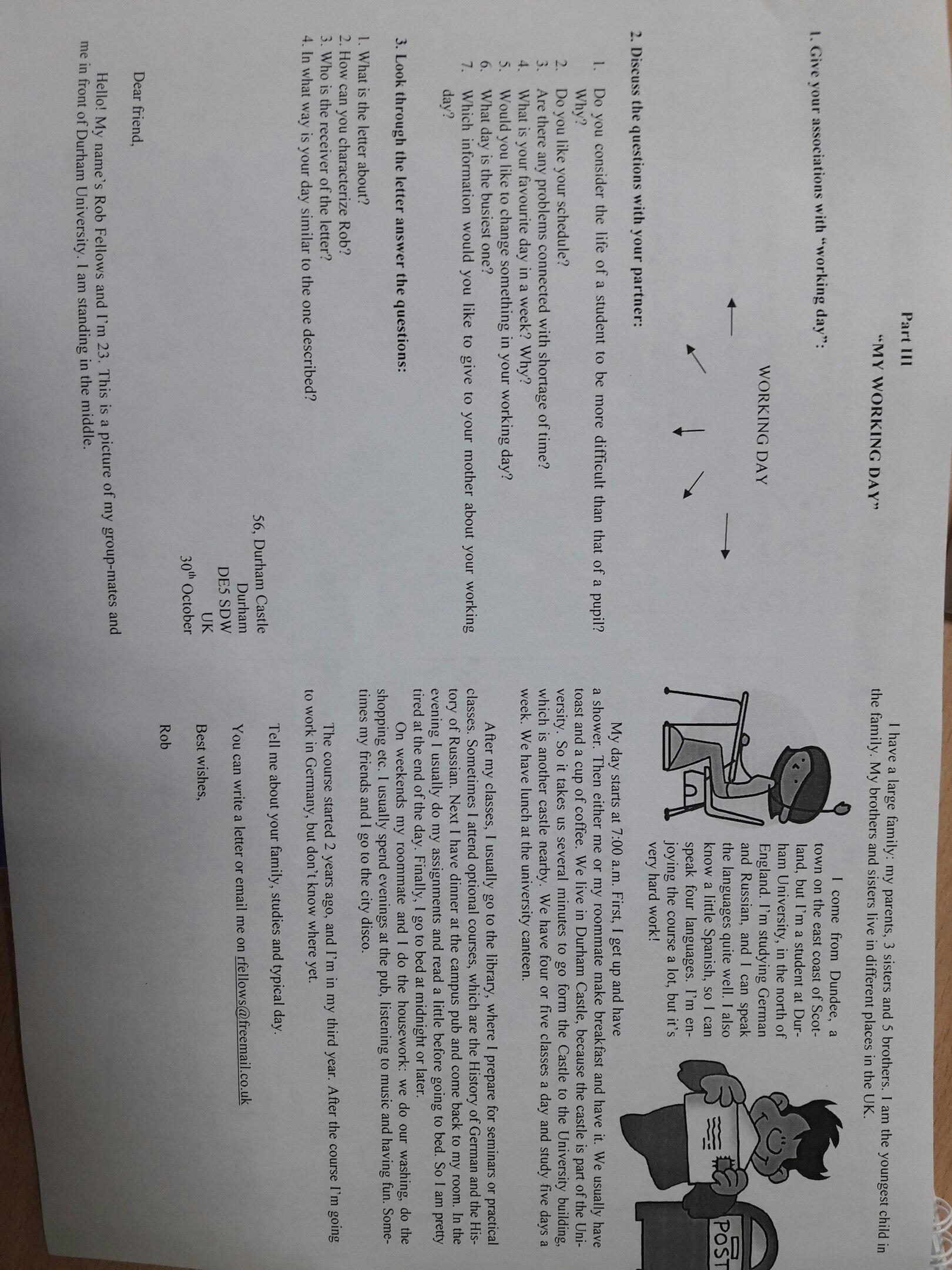 Я приехал из Данди, из города на восточном побережье Шотландии, но я студент университета Дарема. Я изучаю немецкий и русский и я могу хорошо говорить на этих языках. Я так же немного знаю испанский, поэтому я говорю на четырёх языках. Мне очень нравится этот курс, но это очень сложная работа!