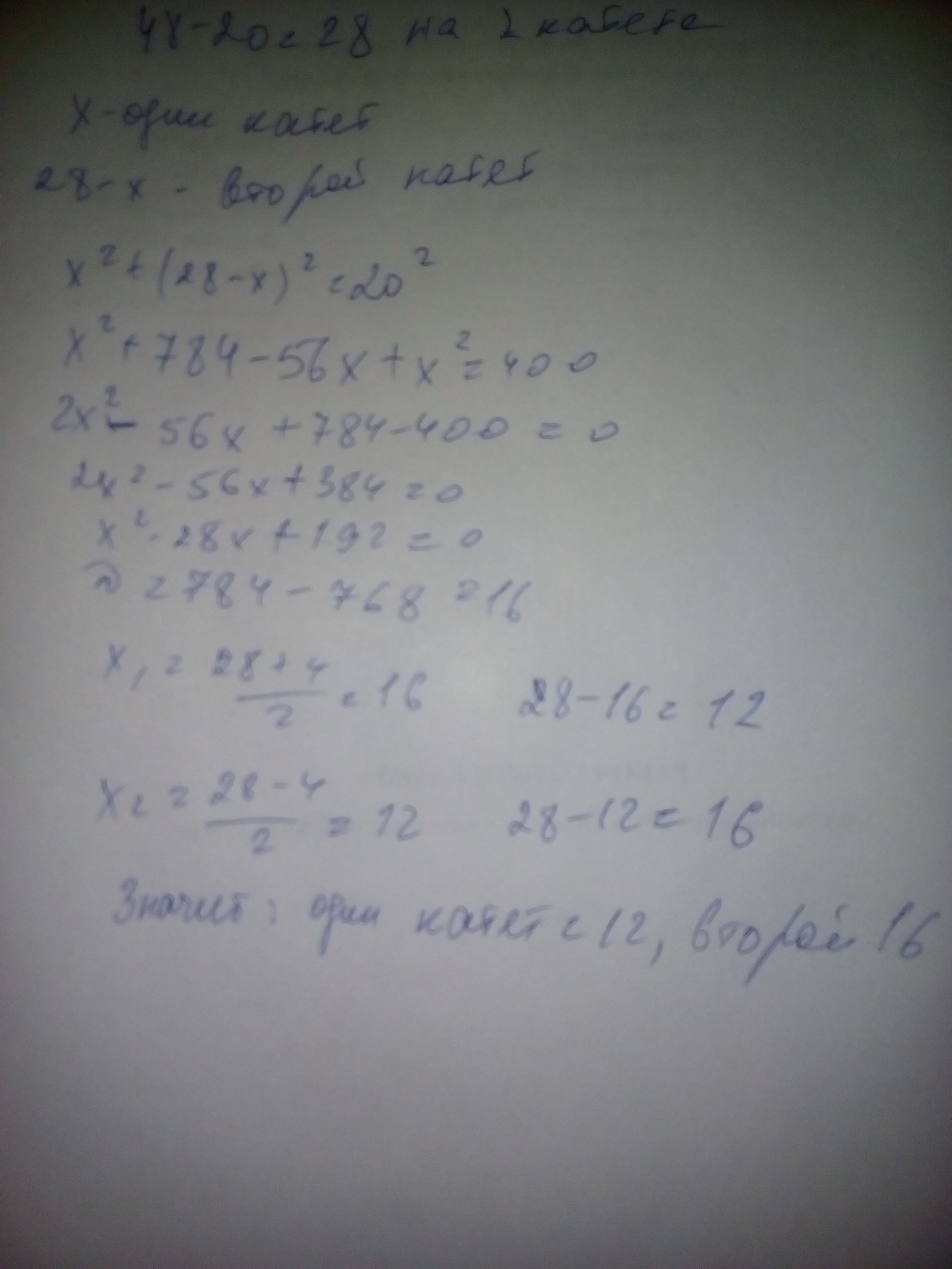 Периметр прямоугольного треугольника равен 48 м, а его гипотенуза равна 20 м. Найдите катеты треугольника