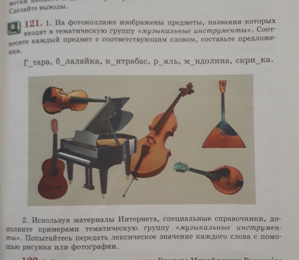 гитара, балалайка, контрабас, рояль, мандолина, скрипка