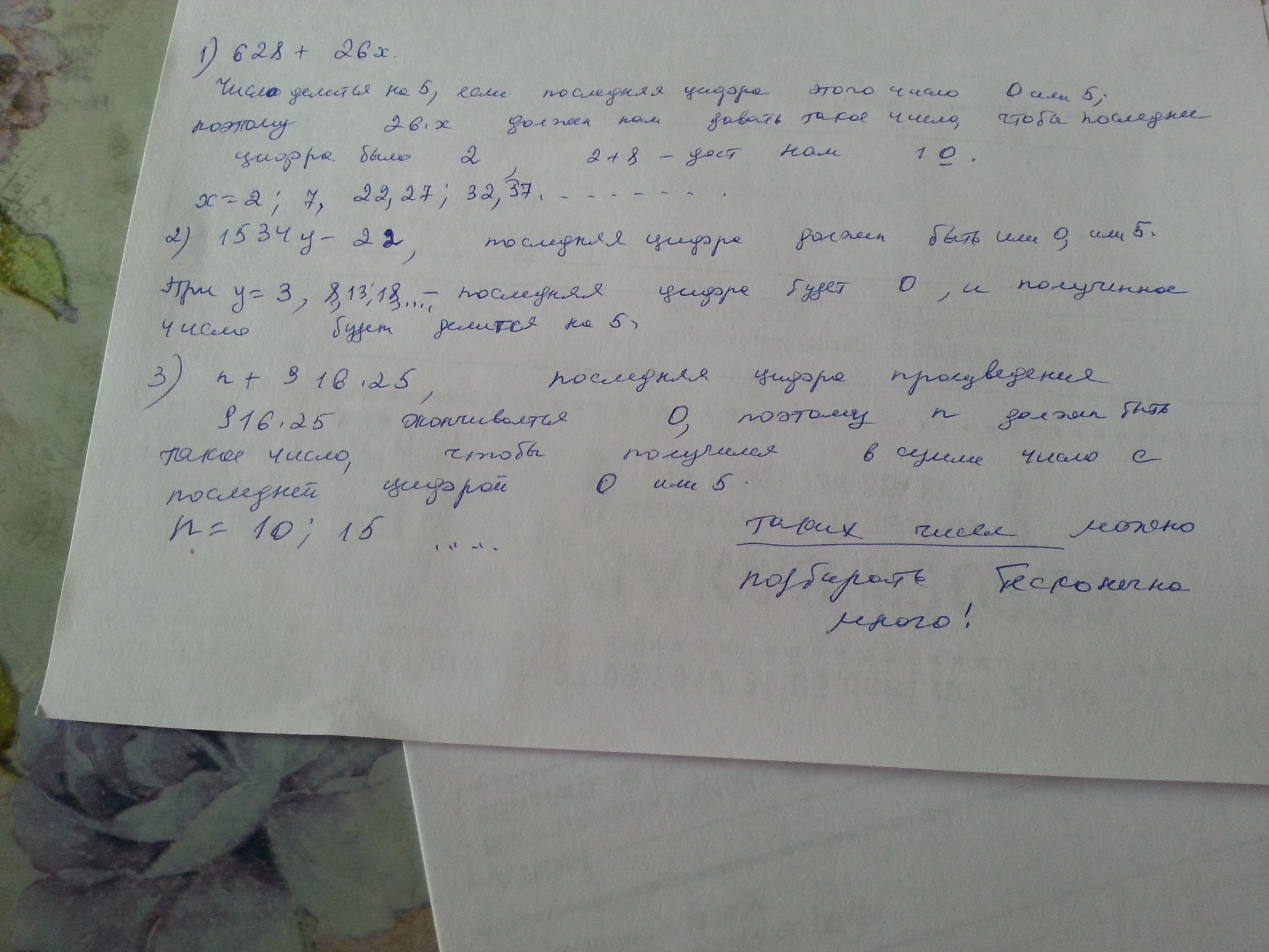 Помогите пожалуйста: Укажите два числа, которые можно подставить место буквы, чтобы делились на 5 значения выражений: 1) 628+26x; 2) 1534y-22; 3) n+916•25. Напишите пожалуйста с решением