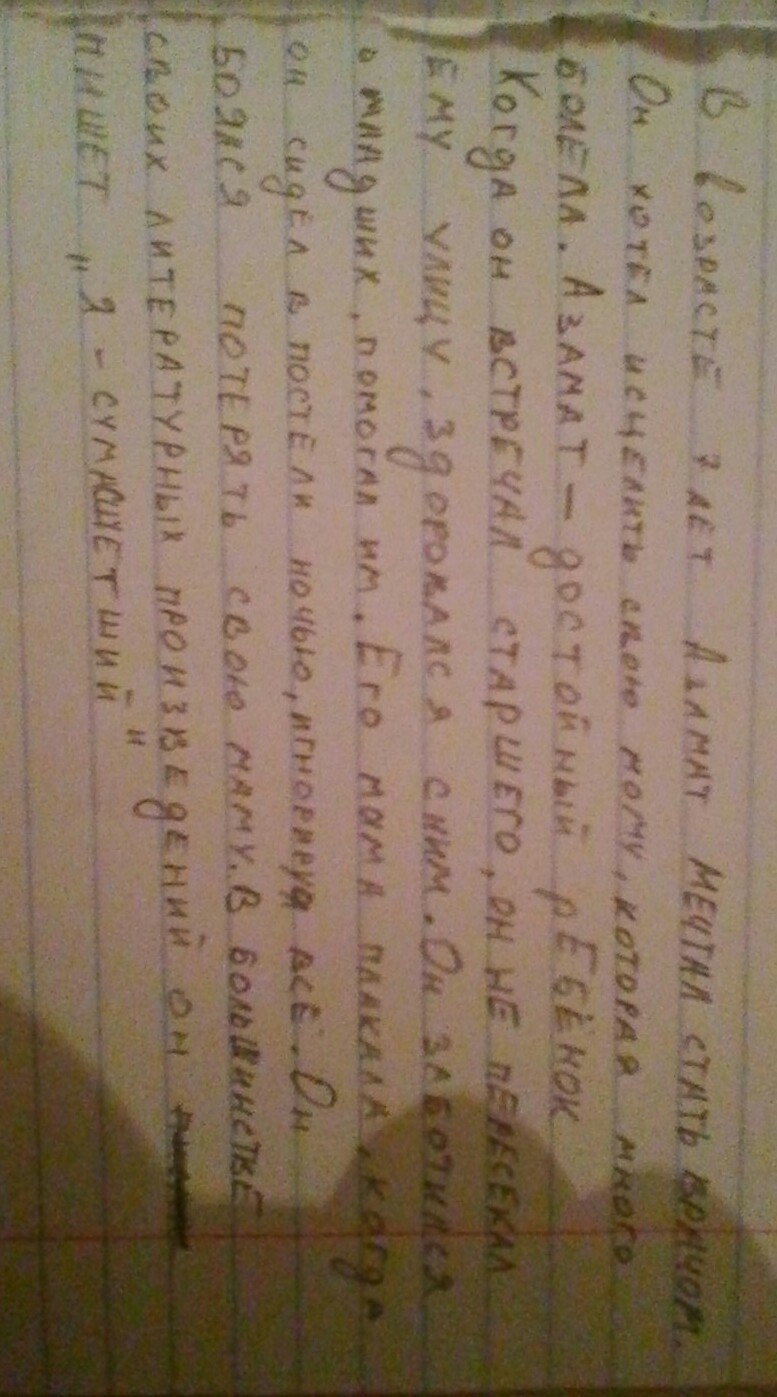Азамат сегіз жасынан бастап дэрігер болуды армандады. Көп ауырып қалатын анасын өзі емдеп жазғысы келді. Азамат - атына заты сай бала. Улкенді сыйлап, кездесіп қалса, салем беріп, алдарына кесіп өтпеді. Ал кішіге қамқор боп, эрдайым көмек беретін. Кундіз еш нэрсені елемейтіндей көнілді журетін бала кешке уйықтар алдында анасы білдіртпей жылап алатын. Ол унемі "анамнан айырылып қалам ба" деп қорықты. Эдебиет сабағынан жазатын шығармаларынын көпшілігінде"дэрігерболсам" деп жазды.