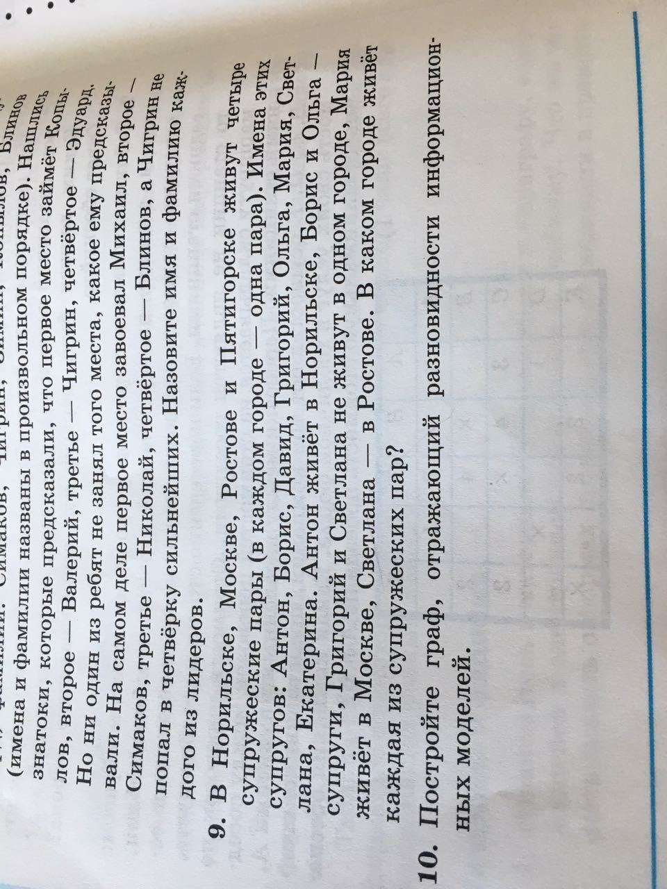 Бориса и Ольга супруги и живут в одном городе, но по таблице видно, что единственный вариант, это то, что они живут в Пятигорске (в других городах уже кем-то занято).