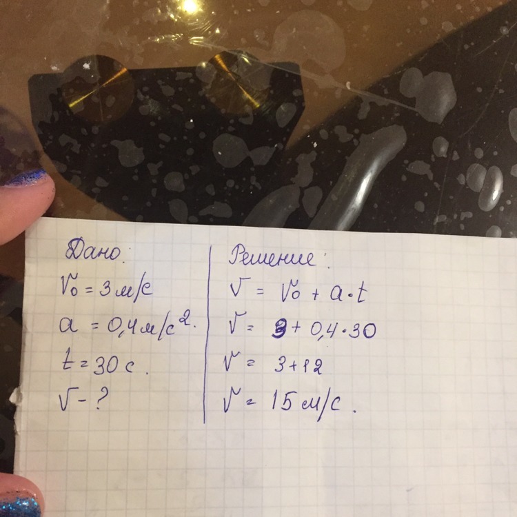 с начальной скоростью 3м,с и с ускорением 0,4 м сек в квадрате. тело находилось в равноускоренном движении. какой будет скорость тела через 30 сек?