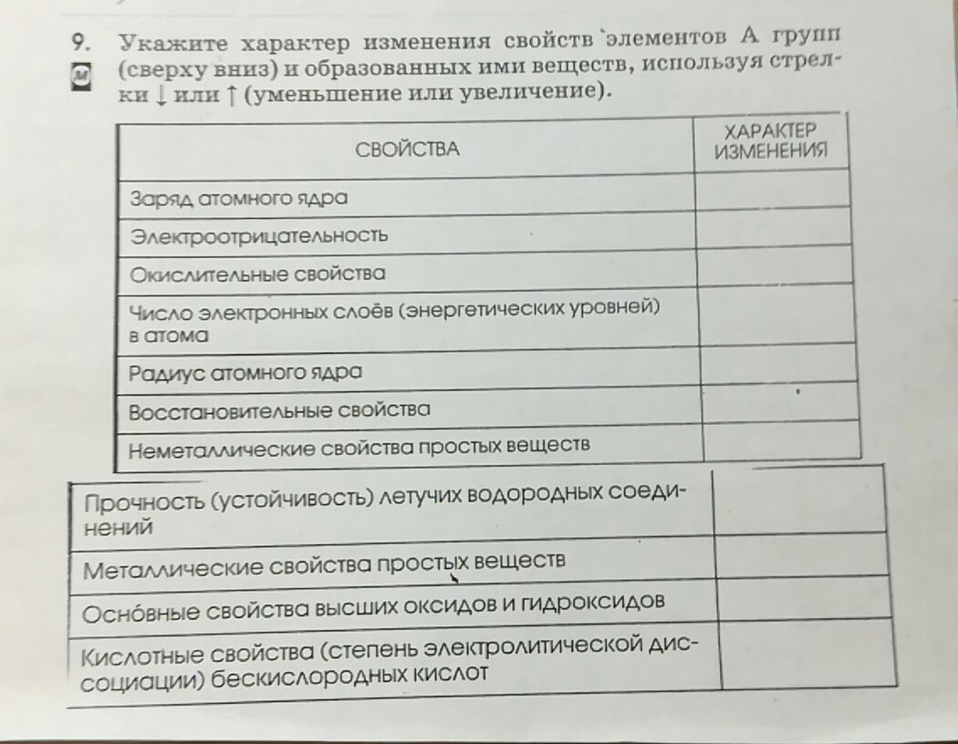 Укажите характер изменения свойств элементов А групп (сверху вниз) и образованных ими веществ, используя стрелки вверх или вниз (уменьшение или увеличение)