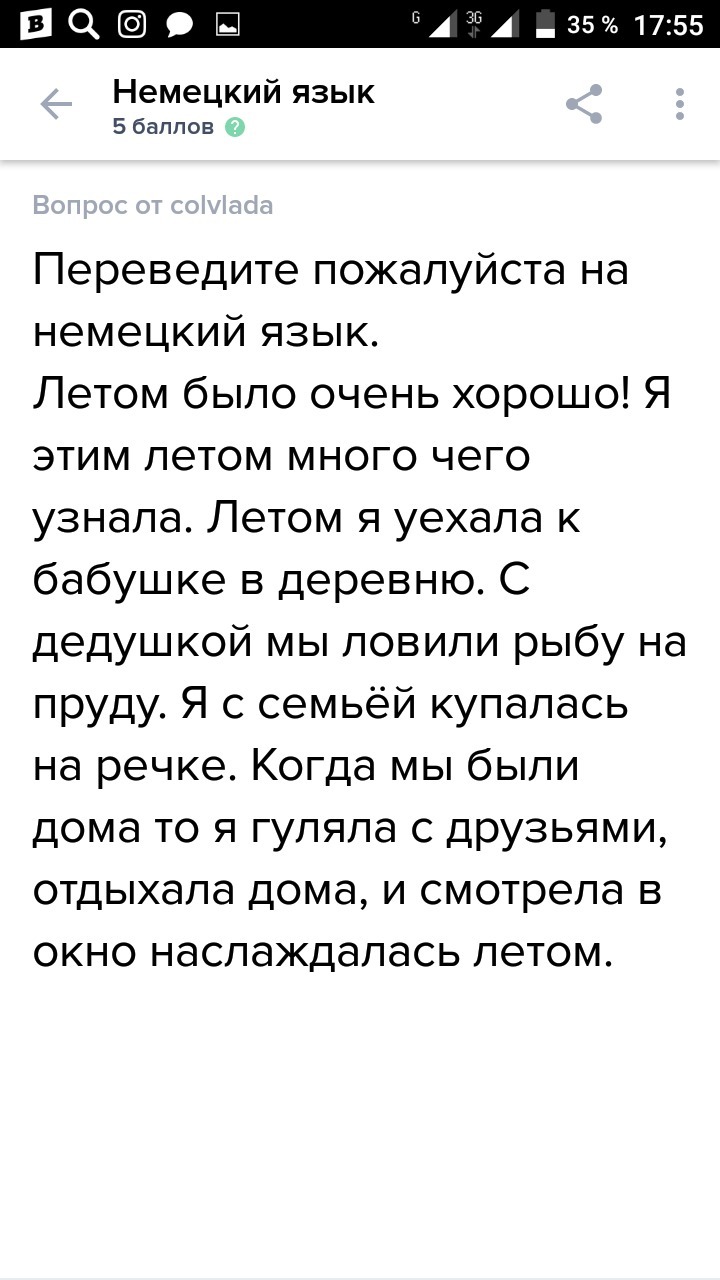 Im Sommer war es sehr gut! In diesem Sommer habe ich viel errkannt. In Sommer bin ich zur Oma ins Dorf gefahren. Mit Opa habe ich am Teich geangelt. Ich habe mit der Familie im Fluss gebadet. Wenn ich zu Hause war , ging ich mit meinen Freunden spazieren, erholte mich zu Hause und sah durch das Fenster und vergnuegte den Sommer.