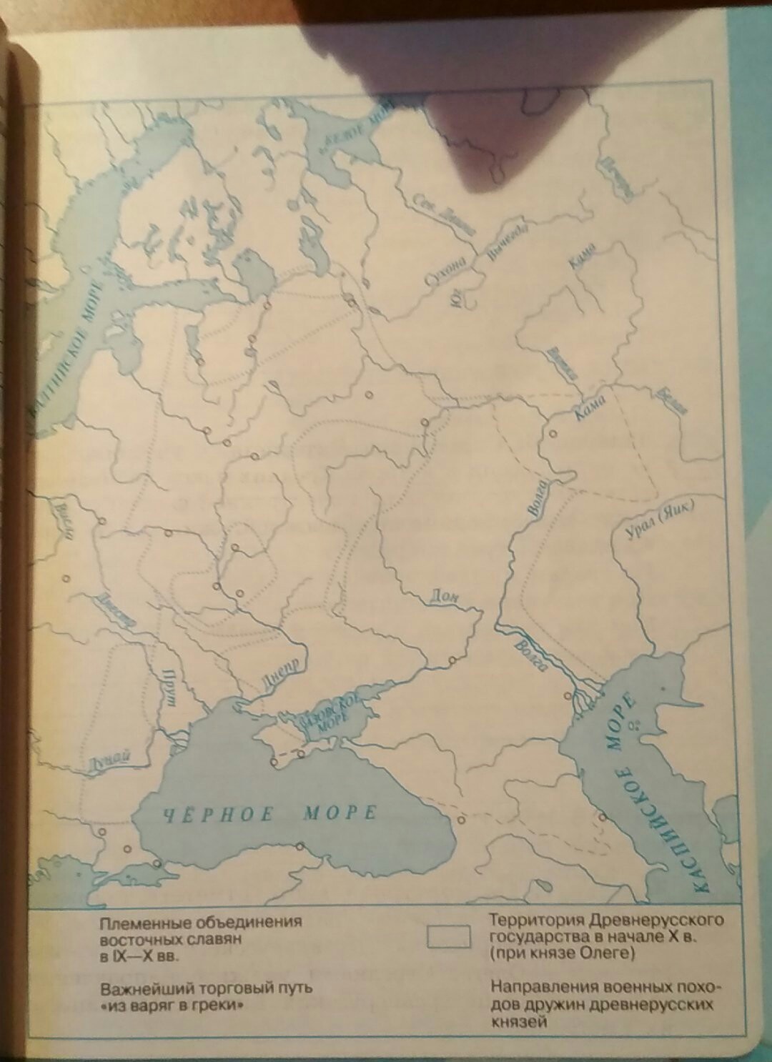На контурной карте отметьте торговый путь "из варяг в греки". Заштрихуйте цветным карандашом территорию Древнерусского государства при князе Олеге. Стрелками укажите направление походов дружин древнерусских князей. Подпишите их имена.