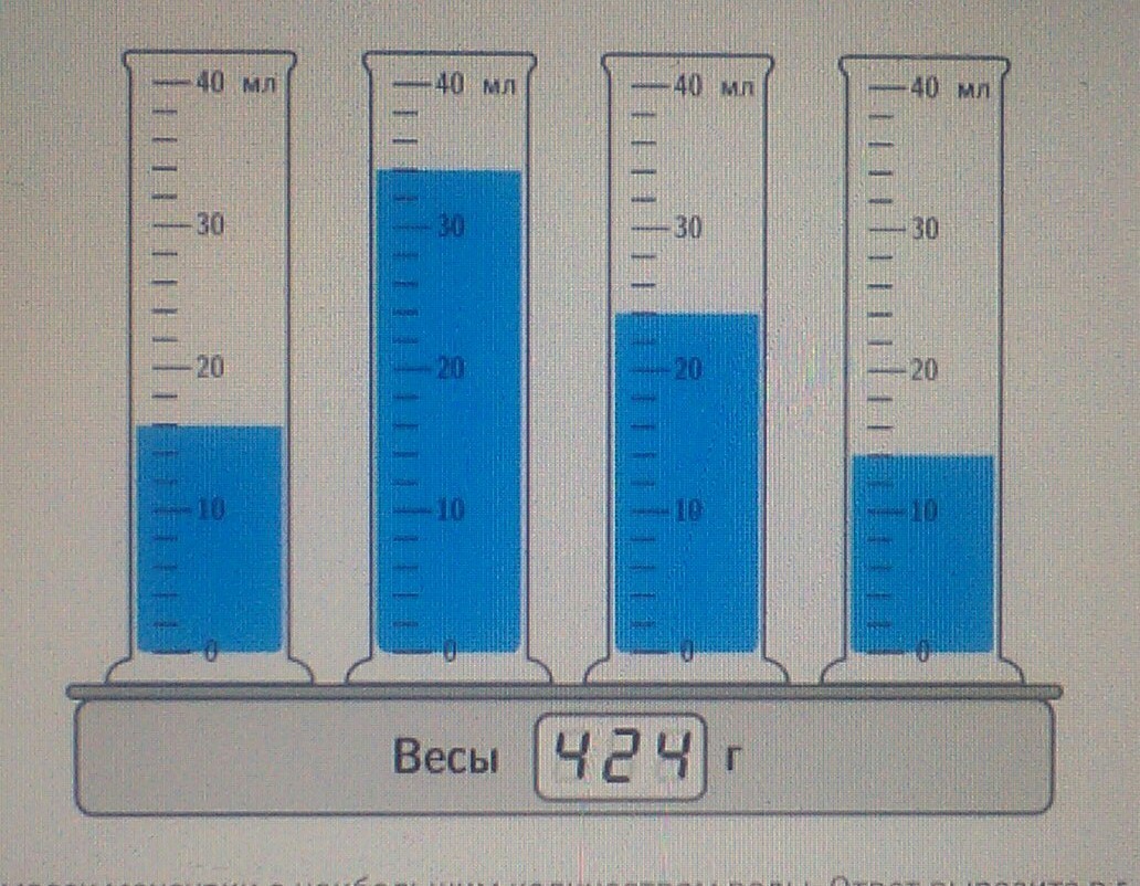Определите массу мензурки с наибольшим количеством воды. Ответ выразите в г, округлив до целых. Масса 1 мл воды составляет 1 г.
