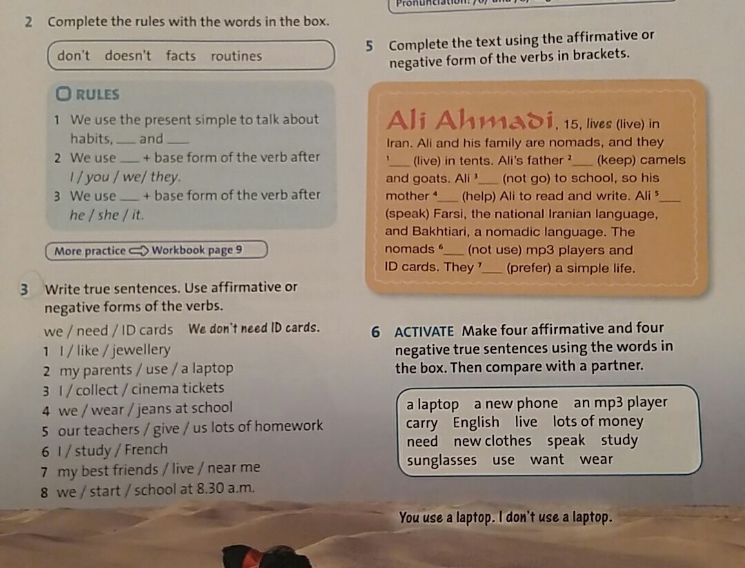 Здесь нужно написать 4 утвердительных и 4 отрицательных предложения о себе, используя данные слова, например: