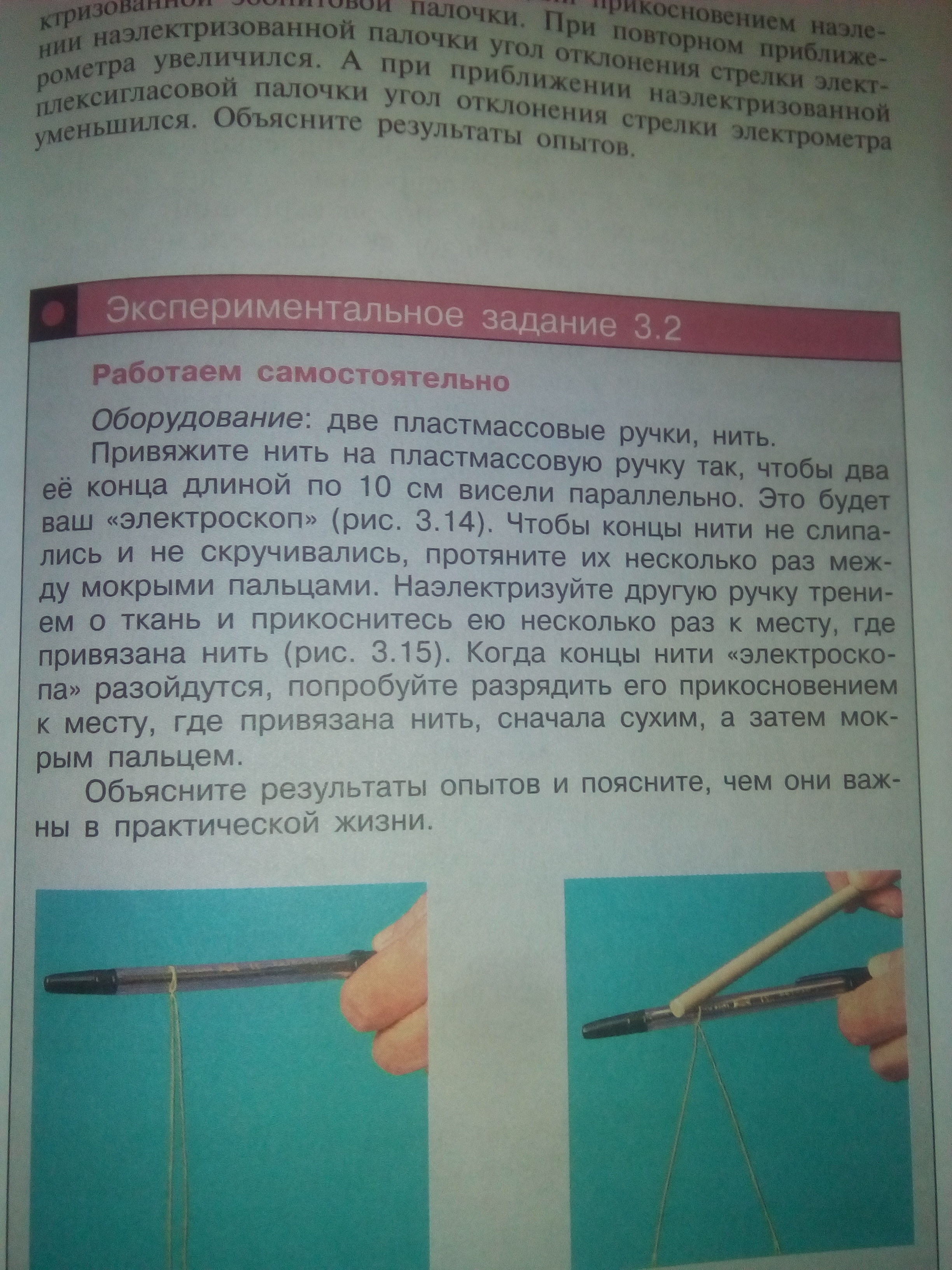 Мокрым пальцем лучше получится убрать заряд с нити, т. к. сопротивление влажного пальца намного меньше сопротивления сухого. В практической жизни важно не работать с потенциально опасными в отношении поражения тока предметами мокрыми руками