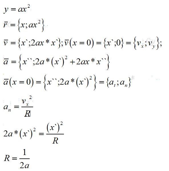 определите чему равен радиус кривизны траектории в точке (0,0)