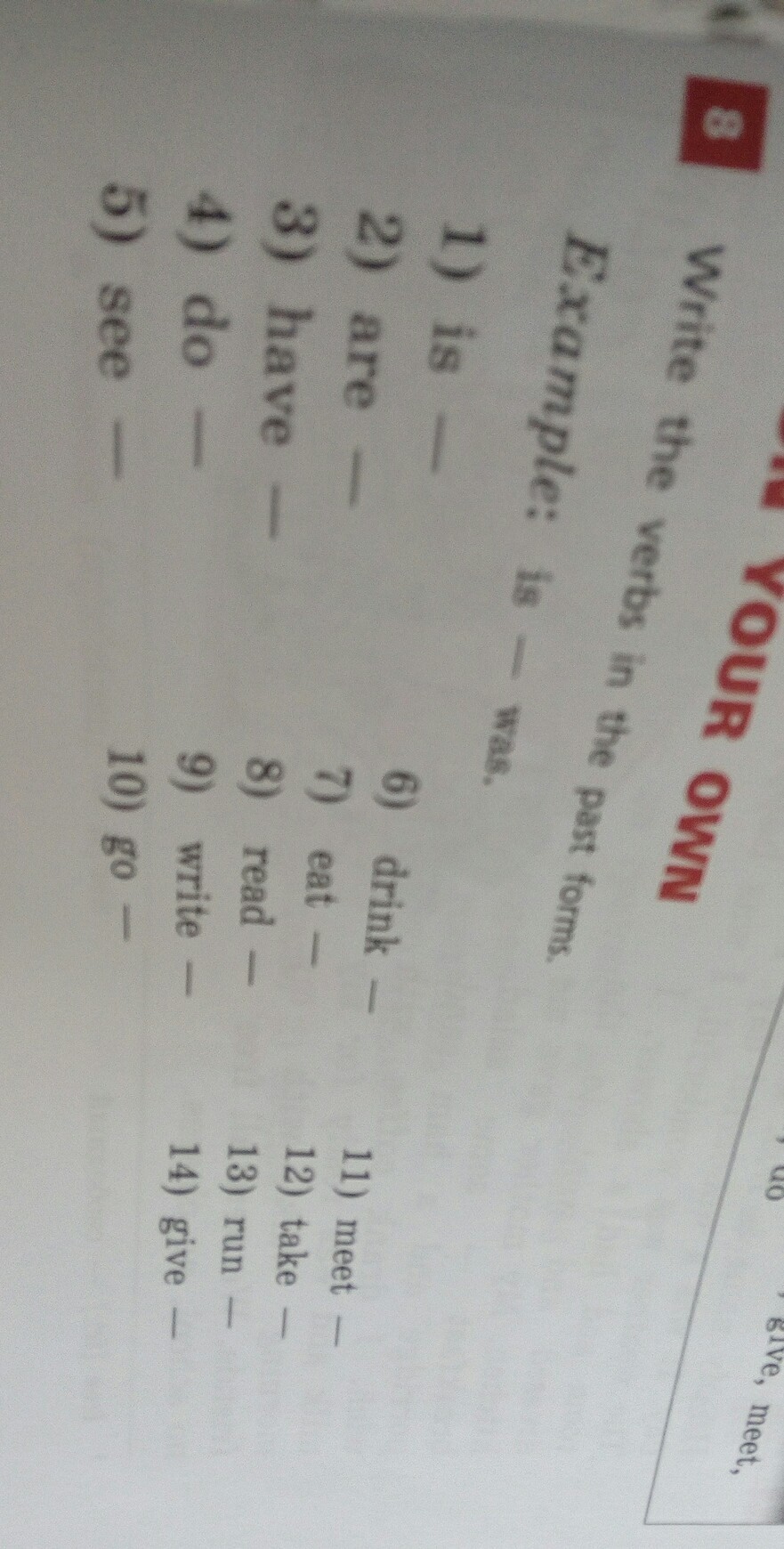 1)was 2)were 3)had 4)did 5)saw 6)drank 7)ate 8)read 9)wrote 10)went 11)met 12)took 13)ran 14) gave