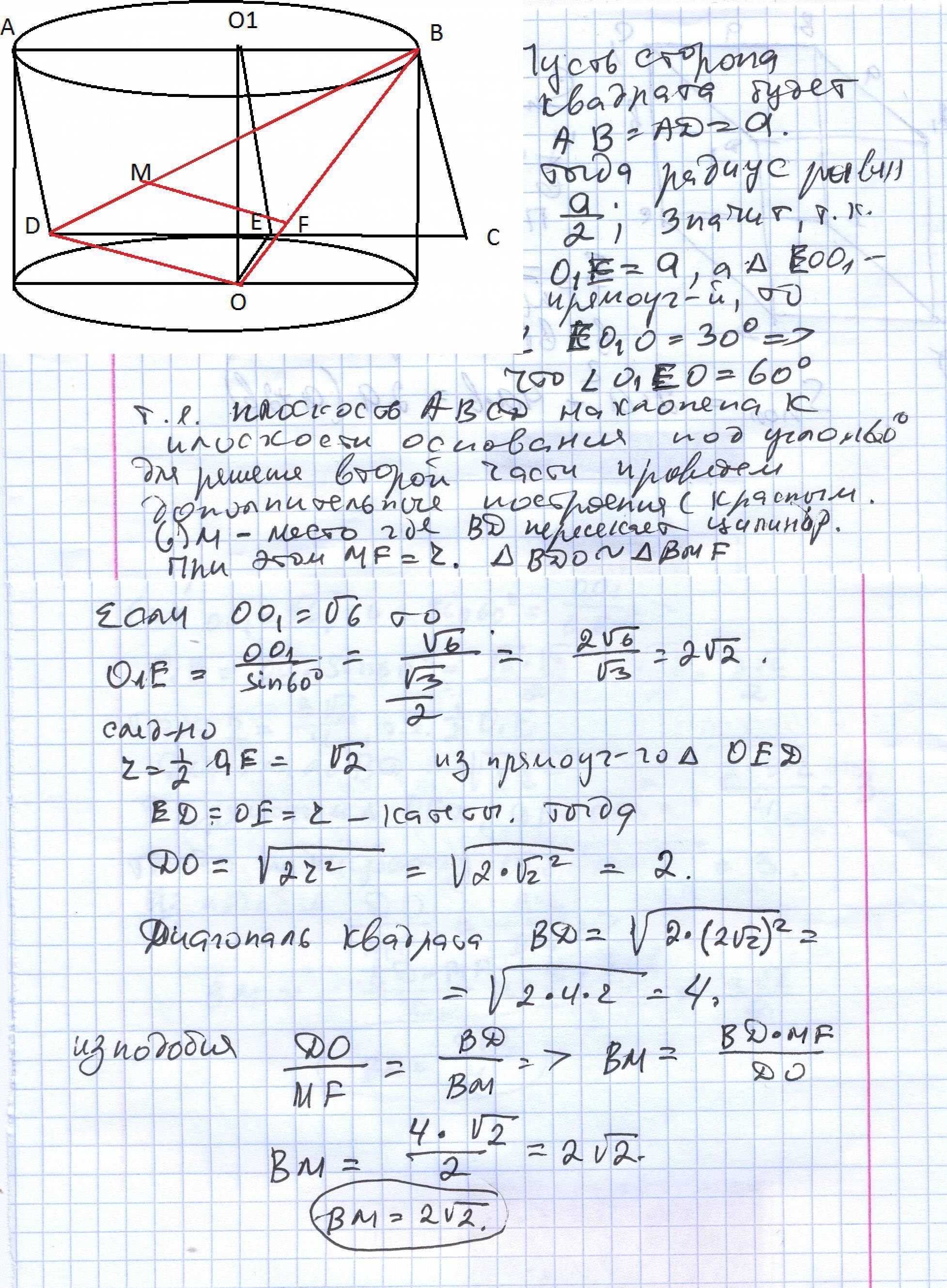 б)Найдите длину той части отрезка BD которая находится внутри цилиндра если образующая равна корень из 6.
