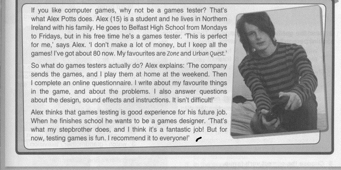 Если вам нравятся компьютерные игры, почему бы не быть тестером игр? Вот что делает Алекс Поттс. Алекс (15) - студент, и он живет в Северной Ирландии вместе со своей семьей. Он отправляется в среднюю школу в Белфасте с понедельника по пятницу, но в свободное время он является игровым тестером. Это идеально для меня, - говорит Алекс, - не делайте много денег, но я держу все игры, которые у меня есть сейчас 80. Мои фавориты - это зона и Urbaneuest. Так что же делают тестеры на самом деле? Алекс объясняет: Компания отправляет игры, и я играю их дома в выходные дни, а затем заполняю онлайн-анкету. Я пишу о своих любимых вещах в игре и о проблемах. Я также отвечаю на вопросы о дизайне, звуковых эффектах и инструкциях Это не сложно Алекс думает, что тестирование игр - это хороший опыт для его будущей работы. Когда он закончит школу, он хочет стать дизайнером игр. Это то, что делает мой сводный брат, и я думаю, что это фантастическая работа! игры - это весело.