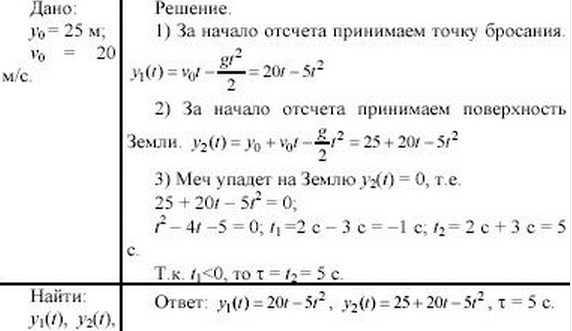 C балкона находящегося на высоте 25 м. от уровня земли бросили вертикально вверх мяч со скоростью 20 м/с. Определить через какое время мяч упадёт на землю и с какой скоростью.