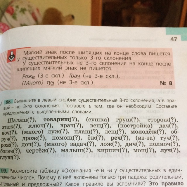 Пишите в левый столбик существительные 3го Склонение а в правый нет третьего склонения поставьте Ь где он необходим составьте предложение с выделенными словами