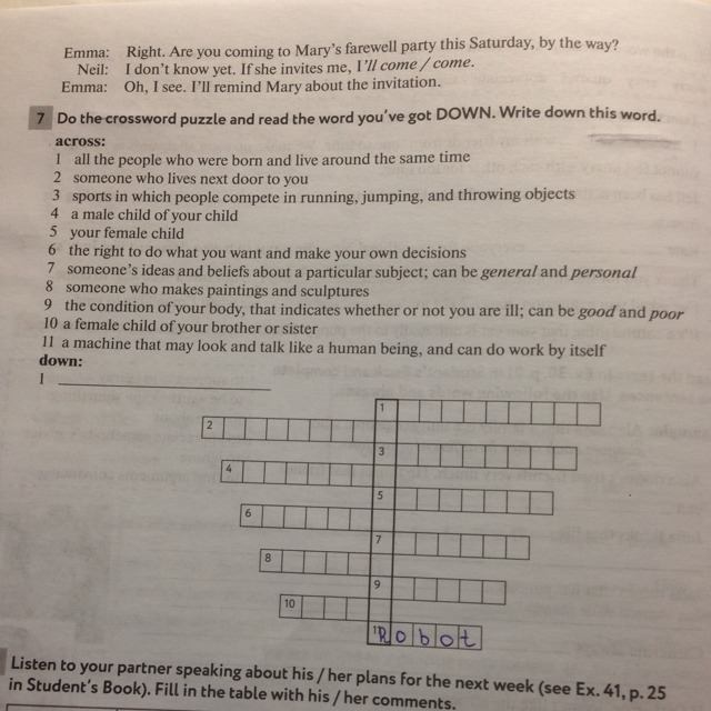 2. neighbor3. athletics4. grandson5. daughter6. freedom7. opinion8. artist9. health (не точно, но скорее всего)10. nieceСлово по вертикали: grandmother