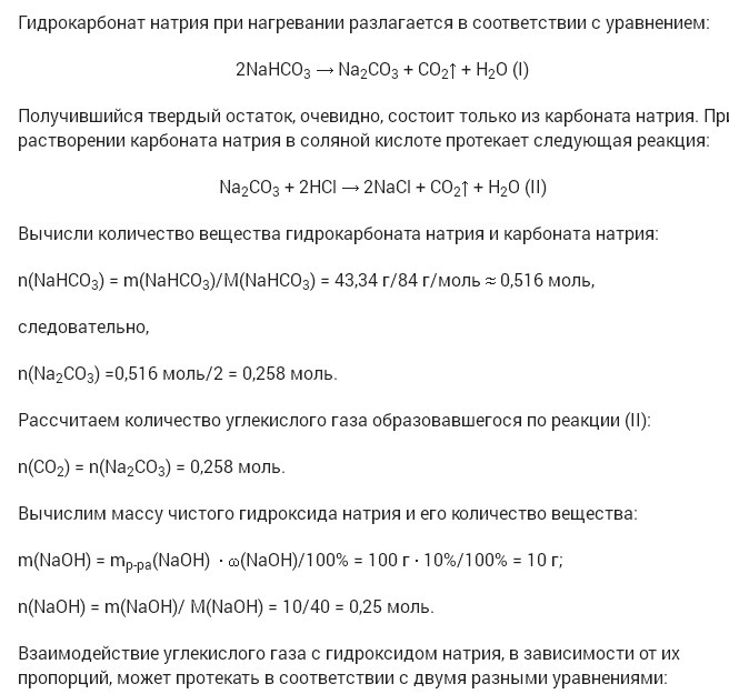 Добрый день! У меня вопрос: вот почему мы для реакции с HCl берем только Na2CO3 - ? А NaHCO3 почему не берем?? Он же ведь тоже в остатке и реагирует с HCl. Условие задачи: Гидрокарбонат натрия массой 43,34 г прокалили до постоянной массы. Остаток растворили в избытке соляной кислоты. Получившийся при этом газ пропустили через 100 г 10 %-ного раствора гидроксида натрия. Определите состав и массу образовавшейся соли, её массовую долю в растворе.