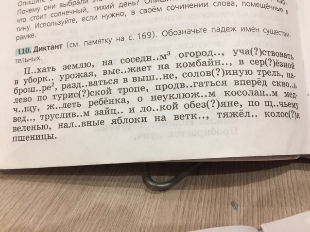 Пахать землю (В.п.), на соседнем огороде (П.п.), участвовать в уборке (П.п.) урожая (Р.п.), выезжает на комбайне (П.п.), в серьёзной брошюре (П.п.), раздаваться в вышине (П.п.), соловьиную трель (В.п.), налево по туристической тропе (Д.п.), продвигаться вперед сквозь чащу (В.п.), жалеть ребёнка (В.п.), о неуклюжем косолапом медведе (П.п.), трусливом зайце (П.п.) и ловкой обезьяне (П.п.), по щучьему велению (Д.п.), наливные яблоки (И.п.) на ветке (П.п.), тяжелые колосья (И.п.) пшеницы (Р.п.)