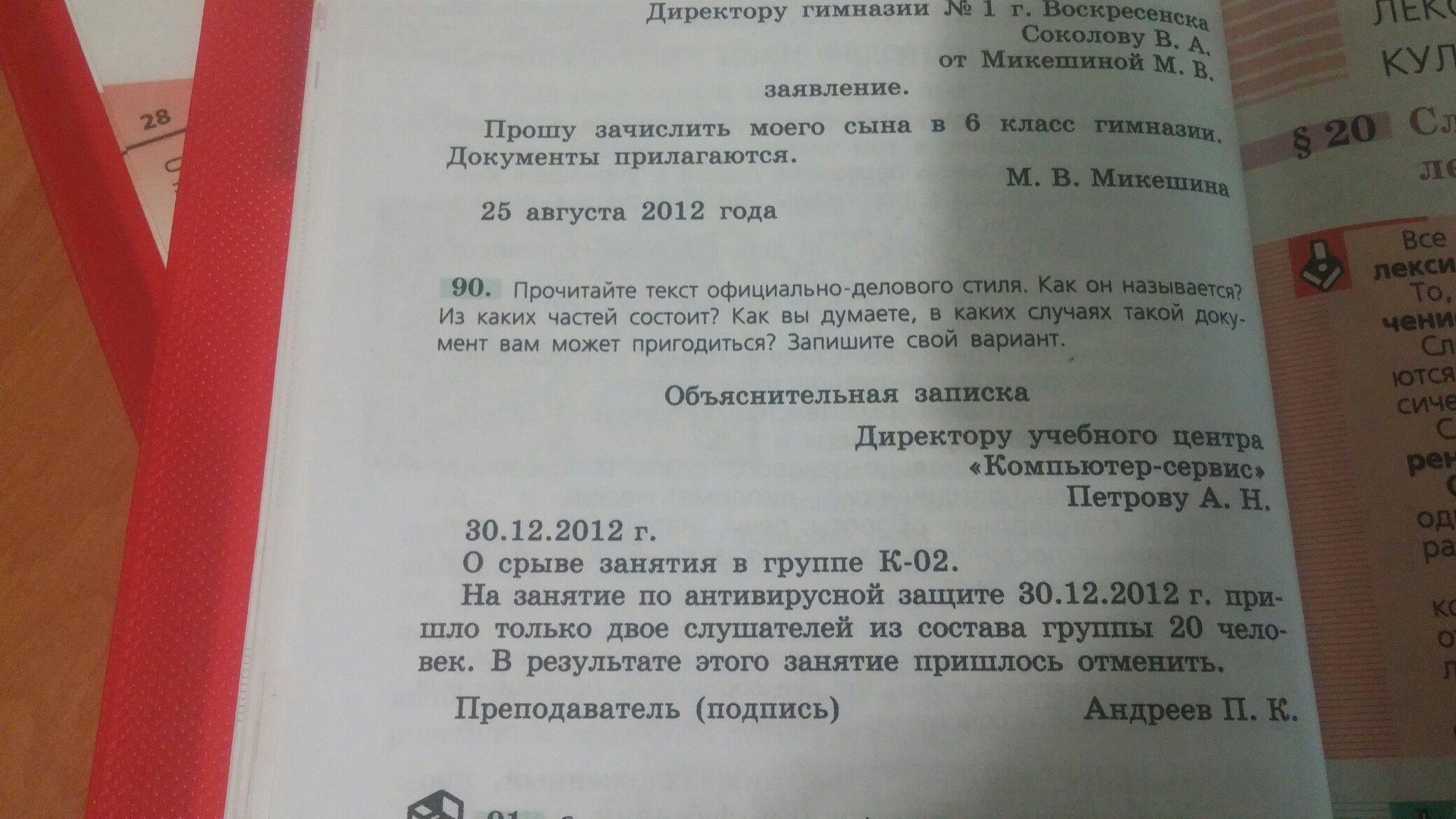 Этот текст официально-делового стиля называется "Объяснительная записка". Состоит он из двух частей. Первая часть содержит факты, послужившие поводом к ее написанию, то есть срыв учебных занятий. Вторая – причины, объясняющие сложившуюся ситуацию. Я из неё узнала, что на занятие пришло два человека из двадцати, поэтому его пришлось отменить. Такой документ мог бы пригодиться, если бы я была преподавателем и у меня бы не состоялся урок по причине неявки большого количества учеников.
