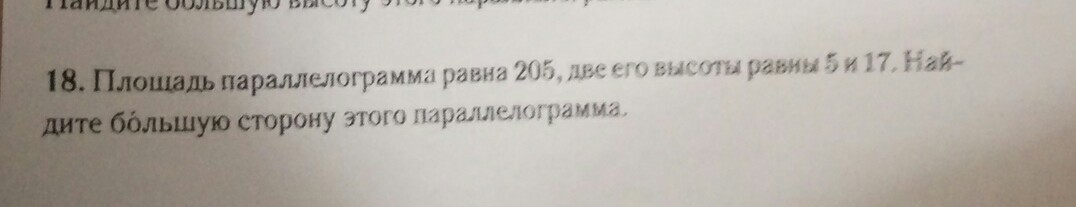 Т.е большая сторона =205/5= 41(S/на меньшую высоту).