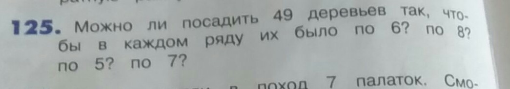 49 не делится на 6,не делится на 8,не делится на 5,а на 7 делится=>можно посадить по 7 деревьев в каждом ряду