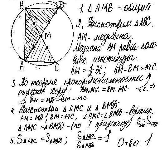 как решить задачу по геометрии: из точки а, лежащей на окружности, проведены две взаимно перпендикулярные хорды аб и ас. Продолжение меианы, опущенной из вершины а треугольника абс, пересекает окружность в точке д. Найти отношение площадей треугольников абс и абд?