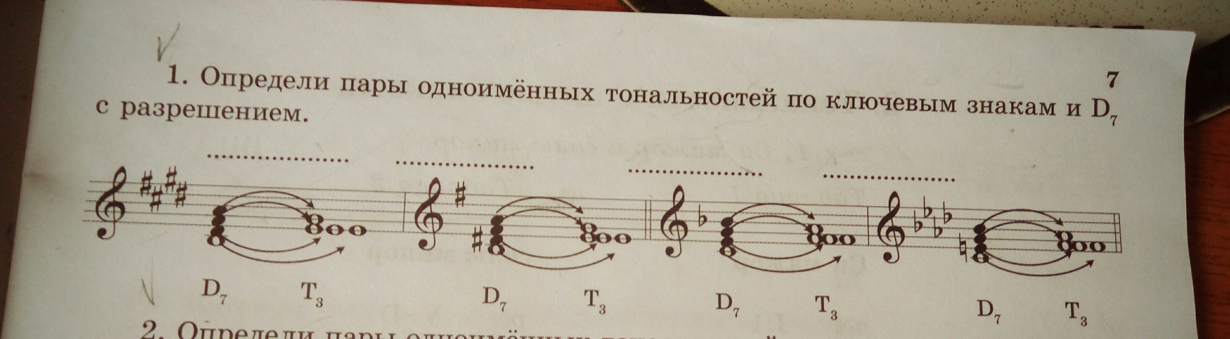 D7 строится на V ступени. Найдя первую ступень тональности каждого аккорда и посмотрев на ключевые знаки, определим тональности: