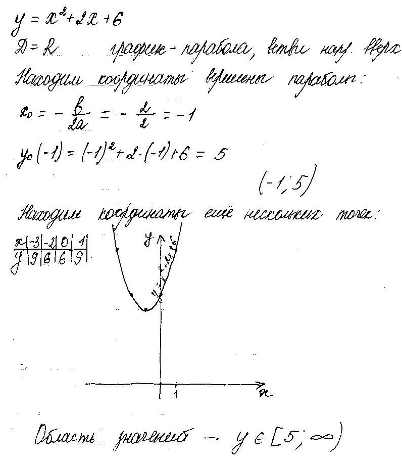 Итак, рисуем параболу, расположенную целиком в верхой полуплоскости с вершиной в т.А (-1; 5), ветвями вверх, проходящую через точку (0; 6), расположенную на оси У.
