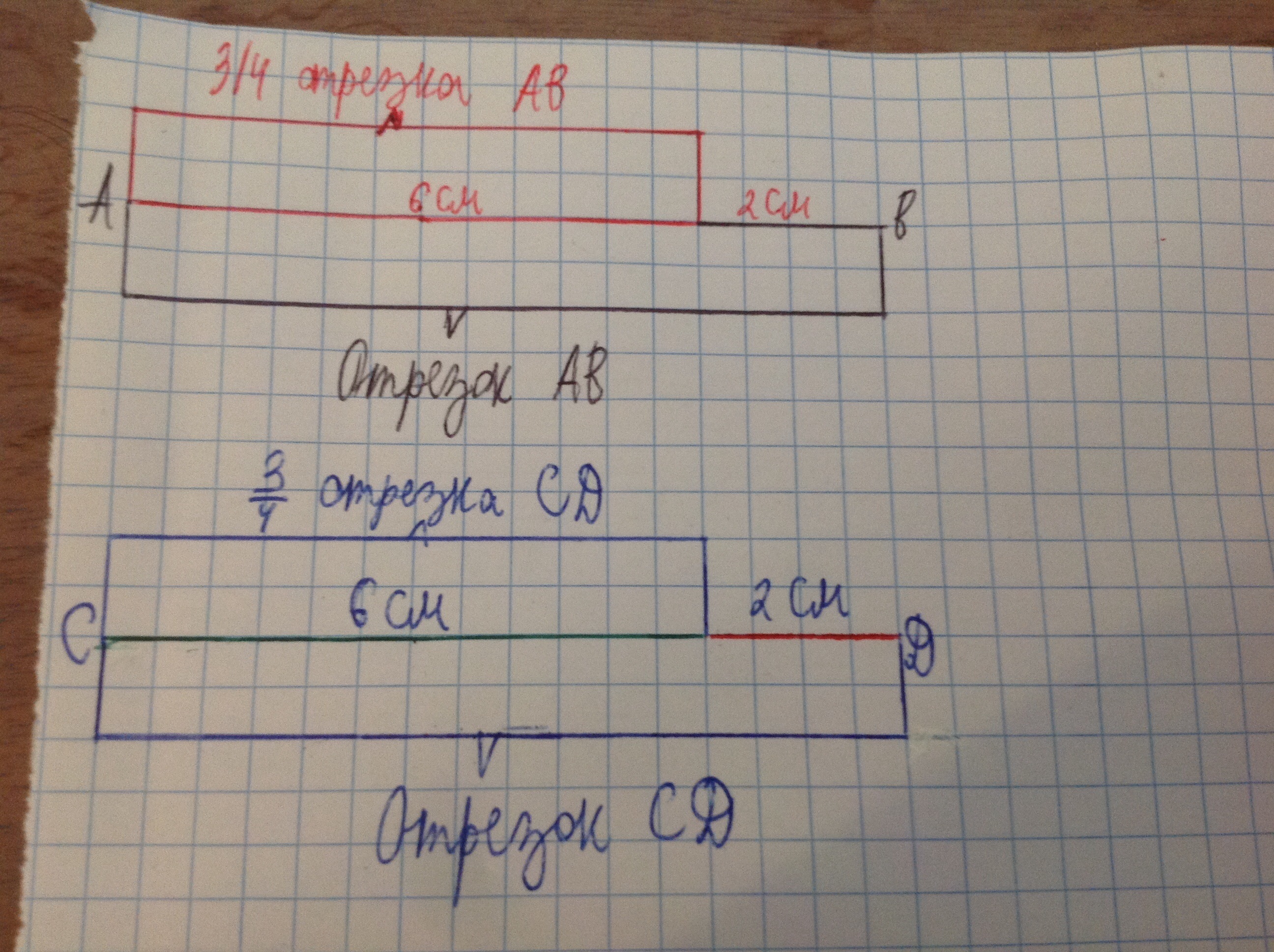 Начертите два отрезка AB и CD длинной по 8 см. Отметьте цветным карандашом 3|4 отрезка AB и 6|8 отрезка CD. Если можно фотографию. Заранее спасибо!