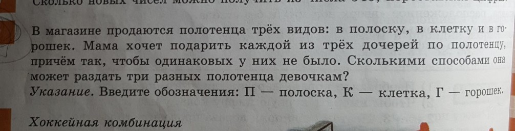 в магазине продаются полотенца трех видов в полоску в клетку и в горошек Мама хочет подарить каждой из трех дочерей по полотенцу причём так чтобы одинаковых у них не было Сколькими способами она может раздать Три разных полотенца девочкам