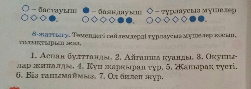 Бүгін аспан булттанды. Сабақ устіне балалар жиналды. Кешегіге қарағанда бүгінгі күн жарқырап тұр. Бүгін алғаш рет жапырақ тусти. Біз ол адамды танымаймыз. ол əдемі билеп жүр.