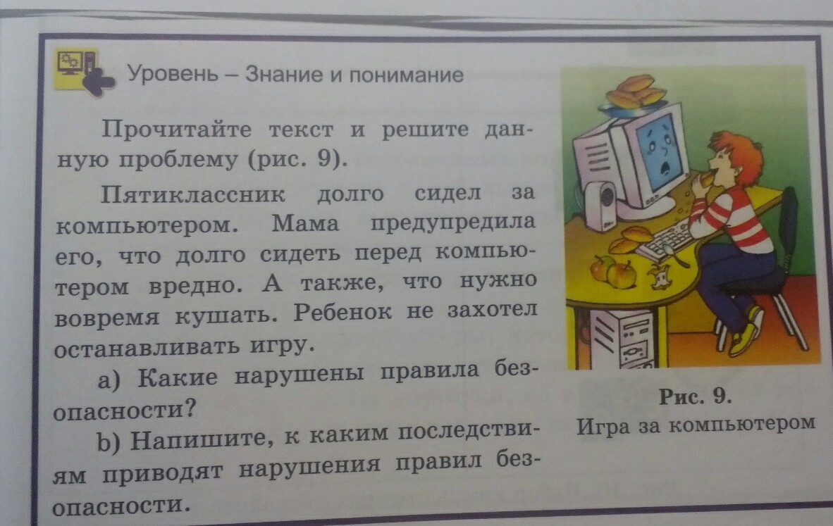 Нарушены правила безопасности:нельзя есть перед рабочим столов, нельзя долго смотреть в экран(через 10мин надо смотреть куда-нибудь токи не в экран )