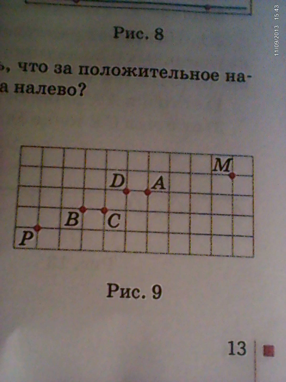 На клетчатой бумаге точки расставлены так, как на рисунке. В каком из указанных направлений нужно двигаться по прямой, чтобы из точки Р попасть в точку М?
