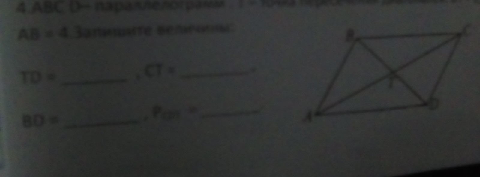 АВСD-- параллелограмм. Т-- точка пересечения диагоналей. ВТ = 2, АС = 2, АВ = 4. Запишите величины: