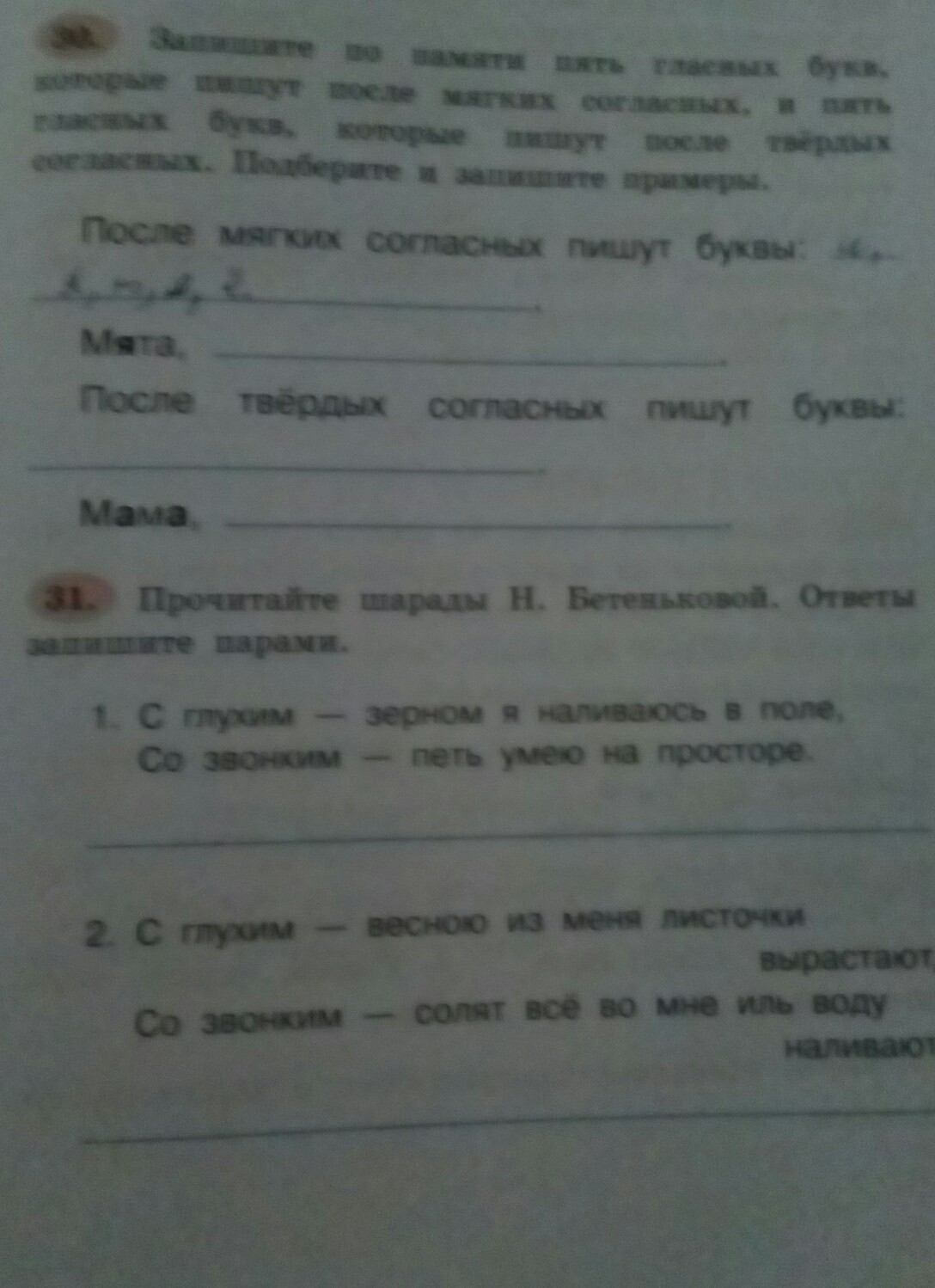 30) После мягких согласных пишут буквы: е, ё, и, ю, я.