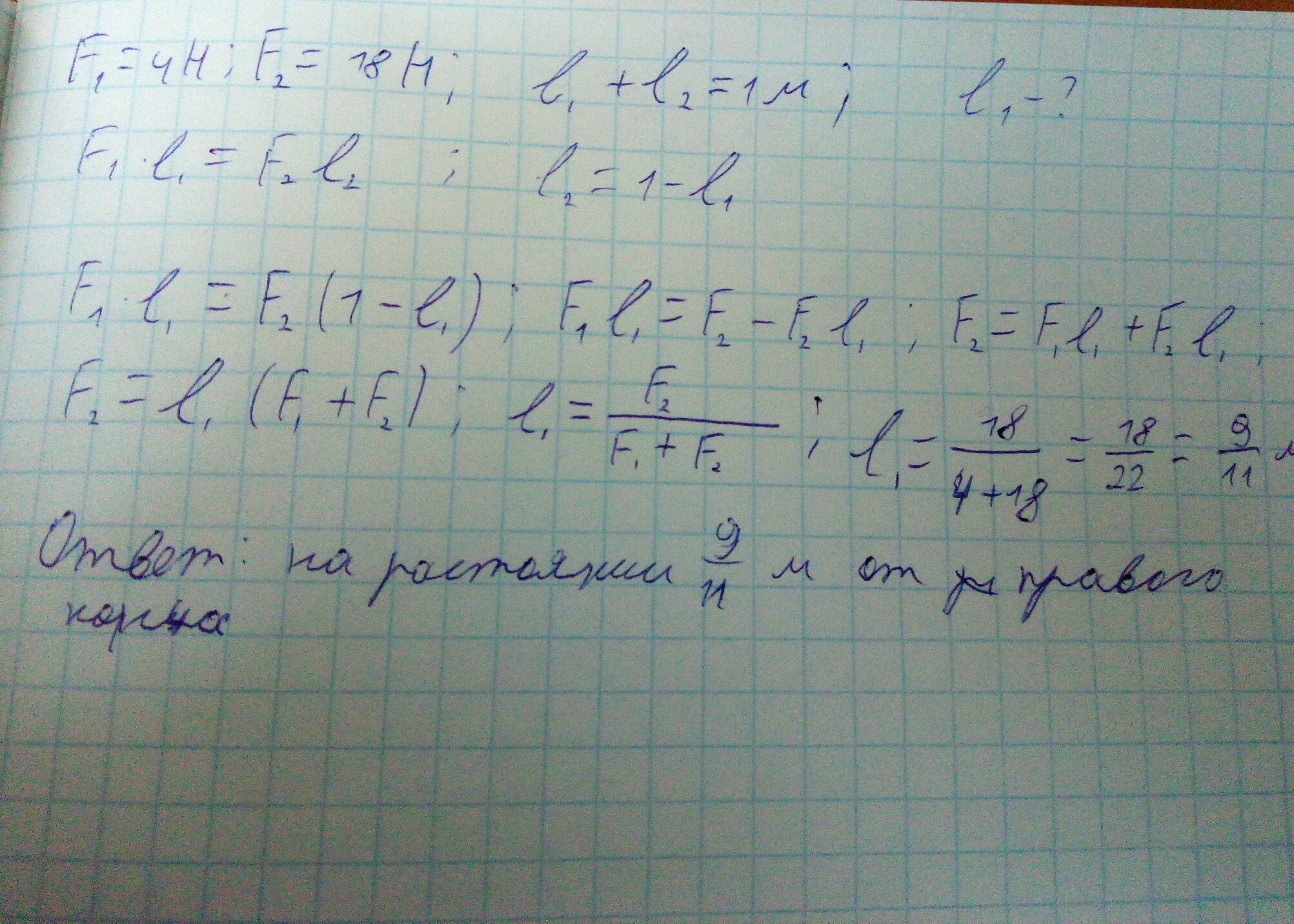 На концы рычага действуют параллельные силы 4Н и 18Н.Длина рычага равна 1м.Где находится точка опоры,если рычаг уравновешен?(Весом рычага пренебречь).