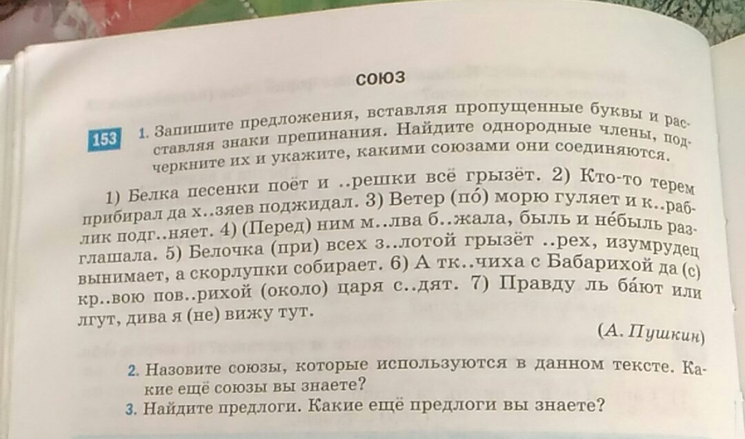 1.Белка песенки поёт и орешки всё грызёт(поёт,грызёт-однородные сказуемые,подчёркиваются 2 линиями, соединены союзом И).2.Кто-то терем прибирал, да хозяев поджидал(прибирал,поджидал-однородные сказуемые, соединены союзом ДА).3. Ветер по морю гуляет и кораблик подгоняет(гуляет,подгоняет-однородные сказуемые, соединены союзом И). 4.Перед ним молва бежала, быль и небыль разглашала(бежала,разглашала-однородные сказуемые;быль и небыль-однородные подлежащие,подчеркиваются одной чертой,соединены союзом И). 5. Белкочка при всех золотой грызёт орех, изумрудец вынимает, а скорлупки собирает. 6. А ткачиха с Барбарихой, да с кривою поварихой около царя сидят. 7. Правду бают или лгут, дива я не вижу тут.(бают,лгут-однородные сказуемые,соединены союзом ИЛИ). Союзы которые я знаю: однако,поскольку, потому что, чего, если