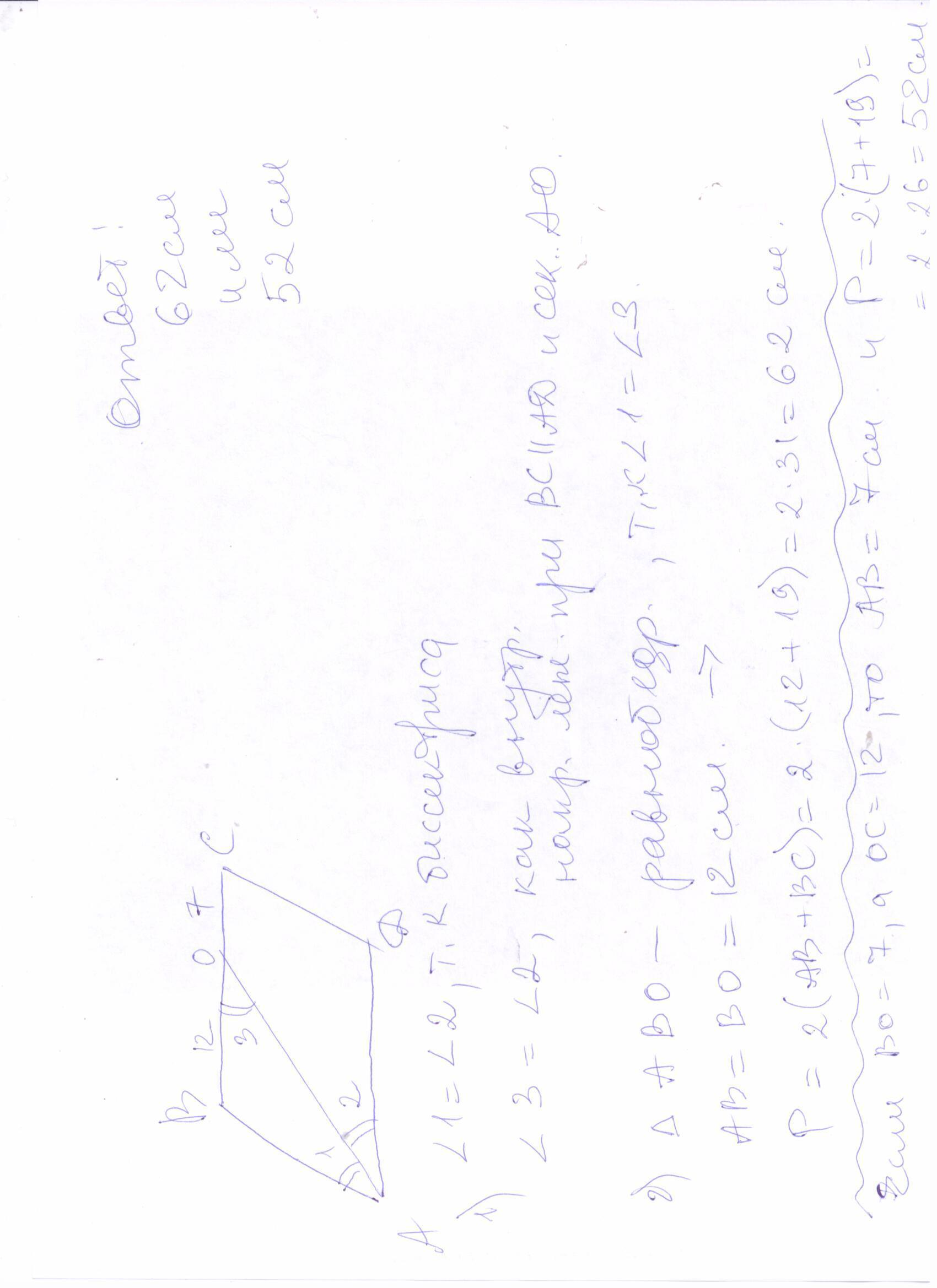 Биссектриса одного из углов параллелограмма делит его сторону на отрезки, длины которых равны 12 и 7 см. Найдите периметр параллелограмма.