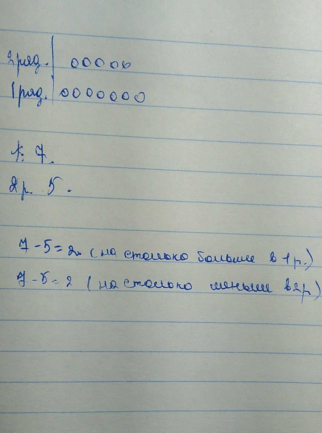 в первый ряд сели 7 учеников, во второй 5 . На сколько учеников было меньше во втором ряду? на сколько учеников было больше в первом ряду ? изобрази условия задачи с помощью кружков в два ряда и ответить на поставленные вопросы