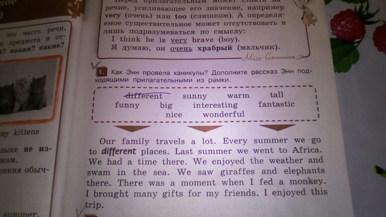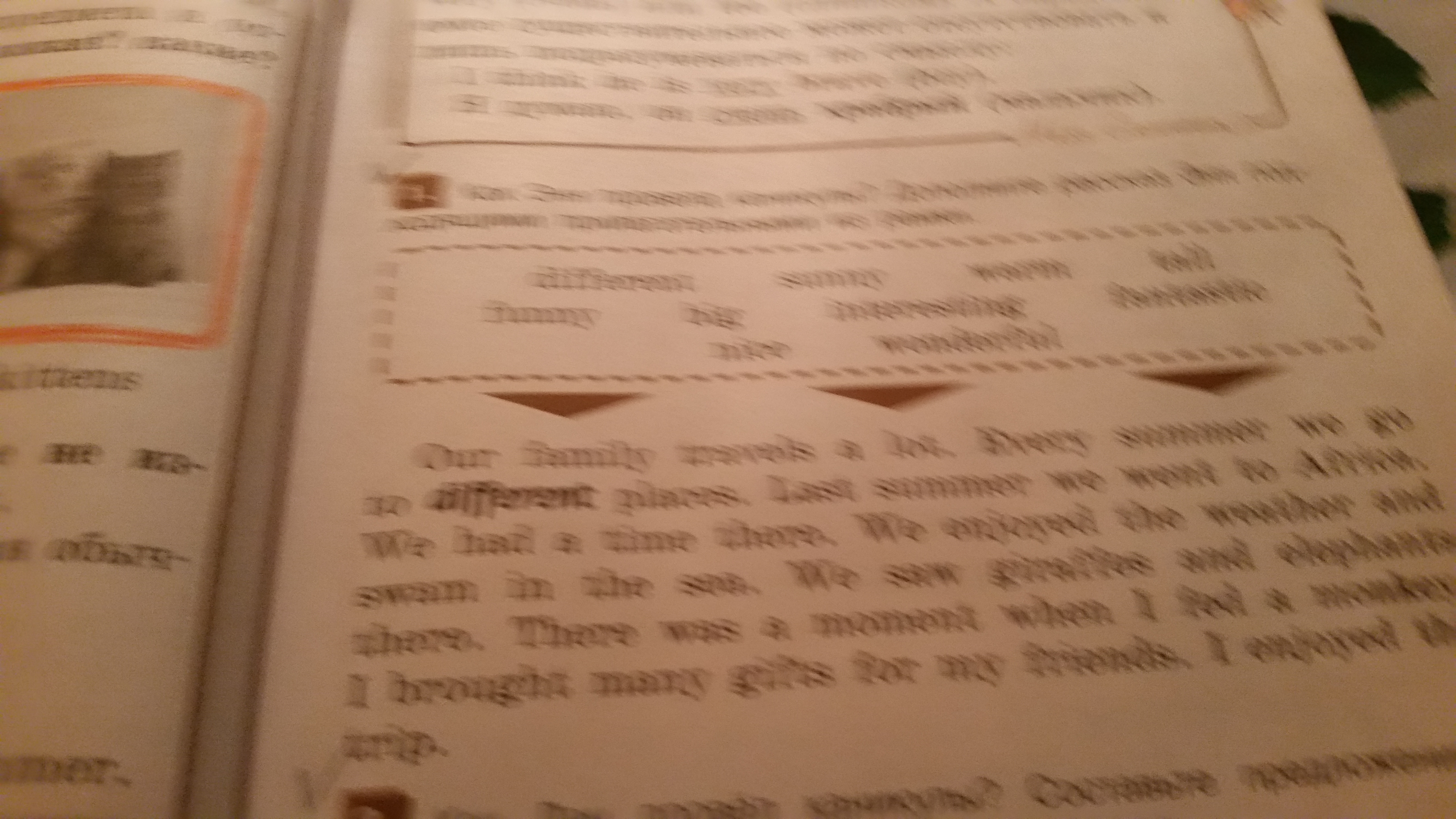 Last summer we went to sunny Africa. We had a nice time there. We enjoyed the warm weather and swam in the sea. We saw tall giraffes and big elephants there. There was a fantastic moment when I fed a funny monkey. I brought many intersting gifts for my friends. I enjoyed this wonderful trip.